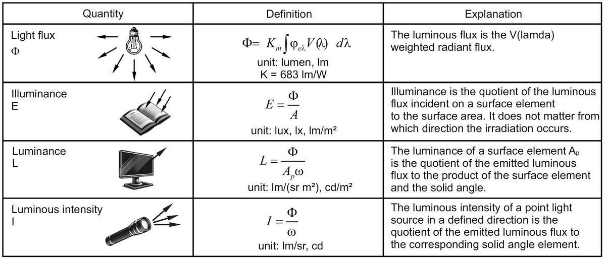 - 单位:勒克斯 (Lux, lx = $lm/m^2$)