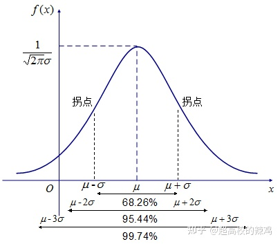 $$f(x) = \frac{1}{\sqrt{2\pi}\sigma} e^{-\frac{(x-\mu)^2}{2\sigma^2}}$$ - 68-95-99.7 法则: