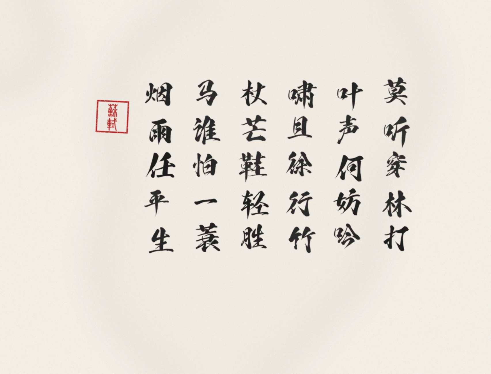 if not (os.path.exists(main_font) and os.path.exists(seal_font)): print(f"❌ 错误:请确保目录下包含 {main_font} 和 {seal_font}") else: artist = ArtisticCalligrapher(main_font, seal_font) content = "莫听穿林打叶声何妨吟啸且徐行竹杖芒鞋轻胜马谁怕一蓑烟雨任平生" seal_text = "蘇軾" artist.generate(content, seal_text, base_font_size=110, output_file="su_shi_calligraphy.jpg")