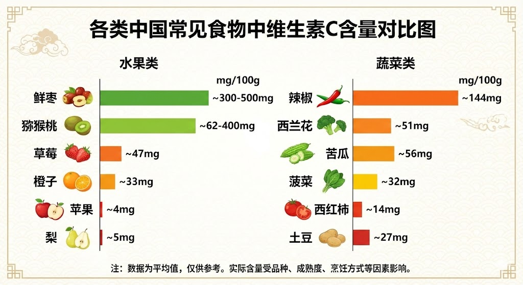 - 生理需求:成年人每日推荐摄入量(RDA)约为 75-90mg,这足以防止坏血病。