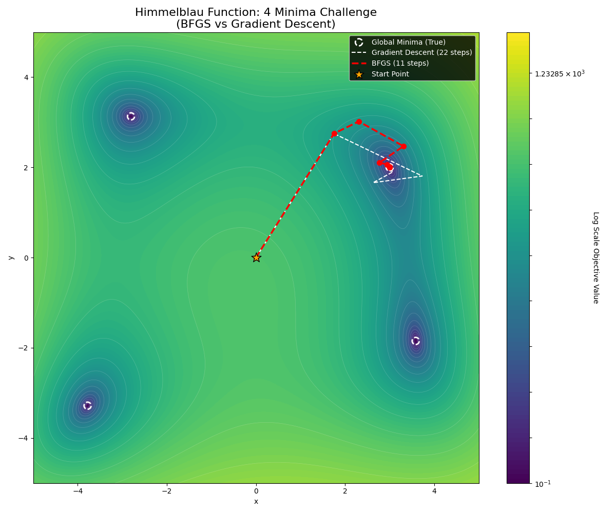 当你运行上述代码时,你会看到 BFGS 画出了一条优雅的弧线直奔终点,而梯度下降则在平坦区域寸步难行。这种巨大的性能鸿沟背后,隐藏着三个深刻的数学原理。
