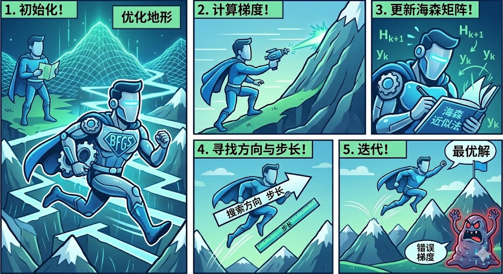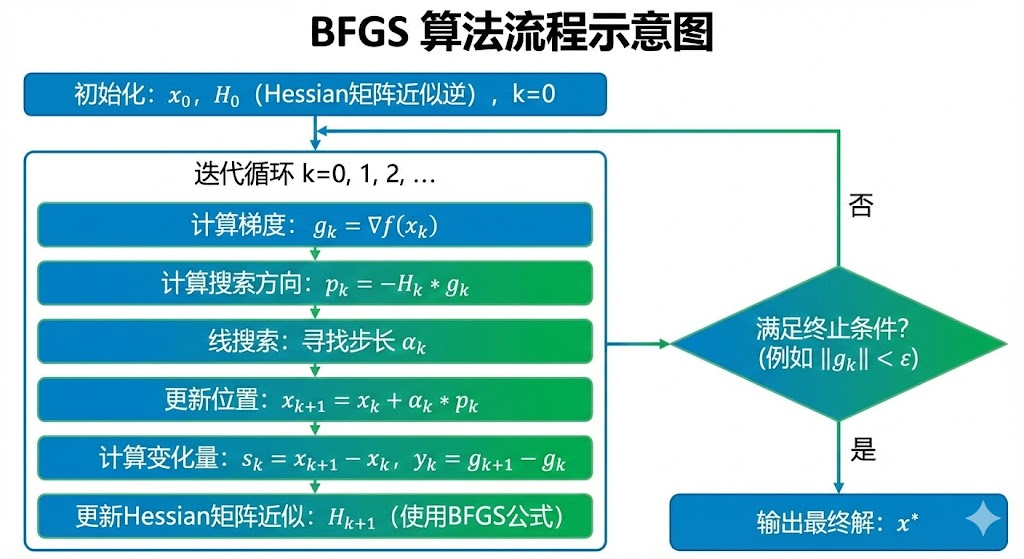 它诞生于 1970 年,由四位数学家独立发现。在随后的几十年里,它是解决无约束非线性优化问题的标准答案。即使在今天,当我们需要极致的收敛精度而非单纯的统计平均时,BFGS 依然是那个不可替代的选择。
