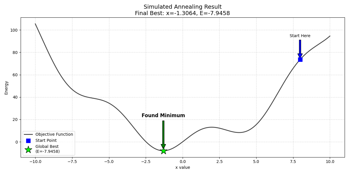 正是这一概率性接受劣解的机制(Metropolis Criterion),使得算法具有了**跳出局部极小值(Local Minima)**的能力。