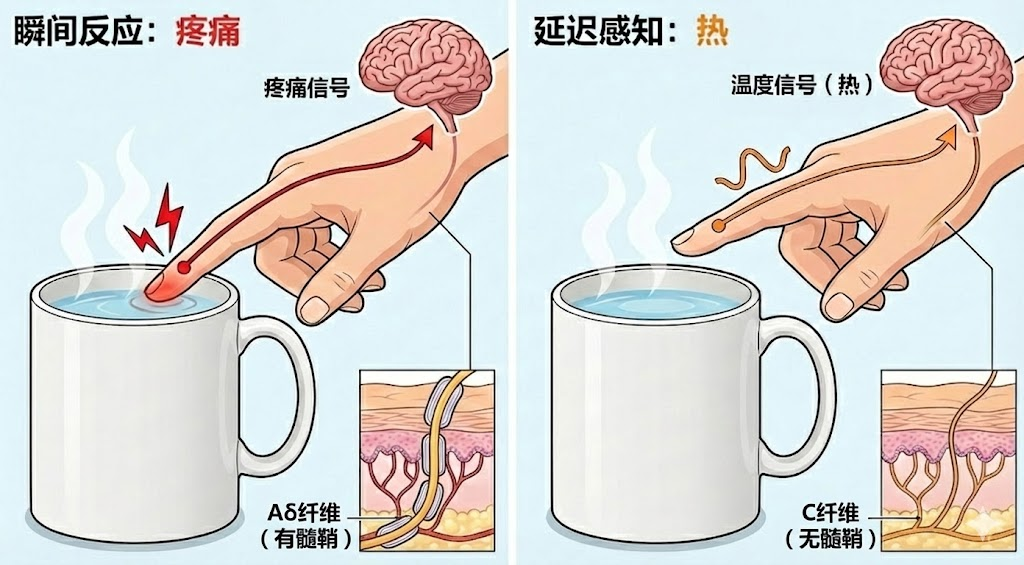 你可能体验过这种感觉:被烫到时,先是感觉到一下极快的刺痛(First Pain),手猛地缩回;过了一两秒钟后,伤口处才开始感受到剧烈的、烧灼般的钝痛(Second Pain)。