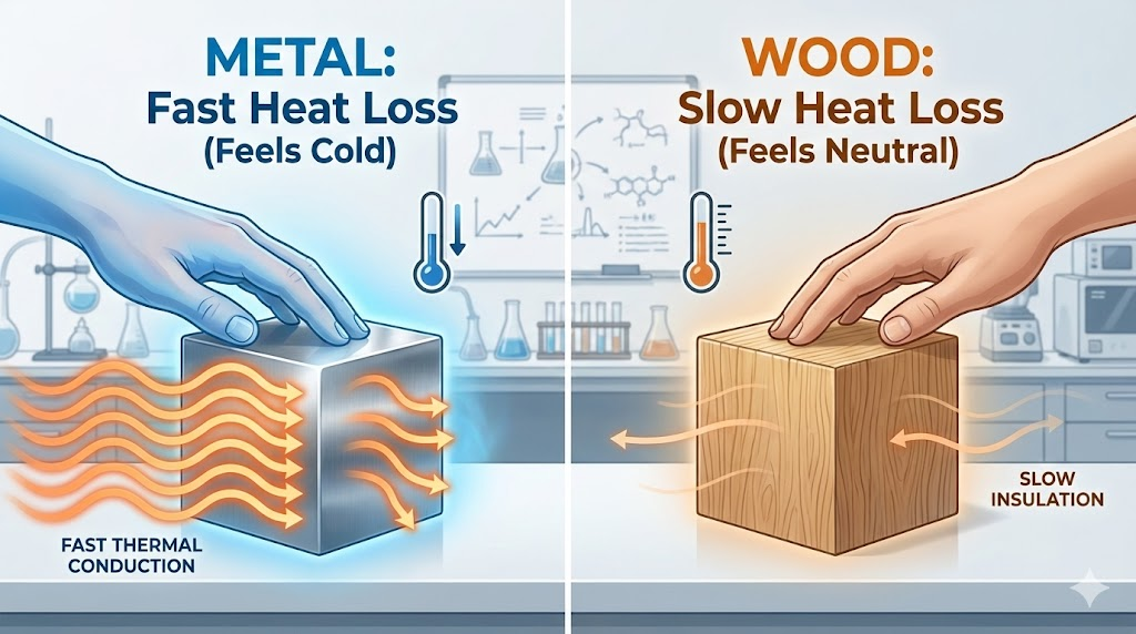 这是一个经典的生活谜题:在同样的室温下,摸金属把手总觉得比摸木头桌子冷。