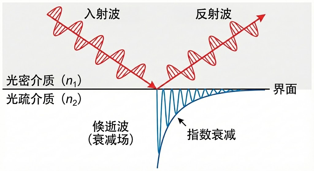 直到麦克斯韦方程组建立后,我们才明白:物理世界的边界从来不是绝对的“墙”,场(Field)总是倾向于弥散。 全反射发生时,光场并没有在界面处突然截止,而是以一种指数衰减的形式延伸到了第二介质中,这就是倏逝波(Evanescent Wave)。