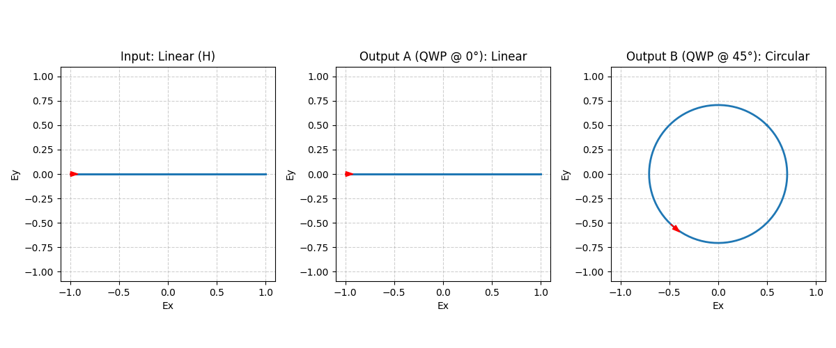 我们来模拟一个经典的场景:线偏振光通过四分之一波片 (QWP) 。